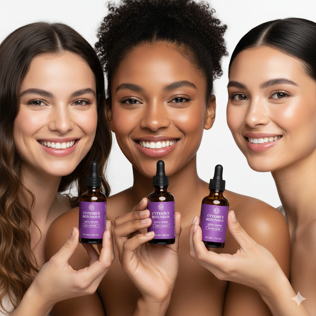 Nuestro suero para la piel Cyperus Rotundus se puede usar con seguridad en la mayoría de las zonas del cuerpo, como rostro, axilas, línea del bikini, piernas y brazos. Para uso facial, evite el contorno de ojos.